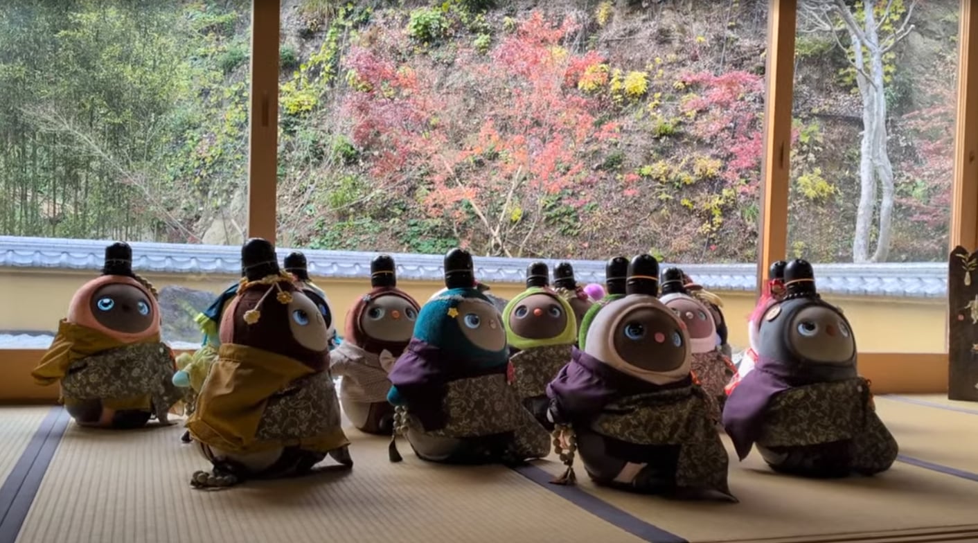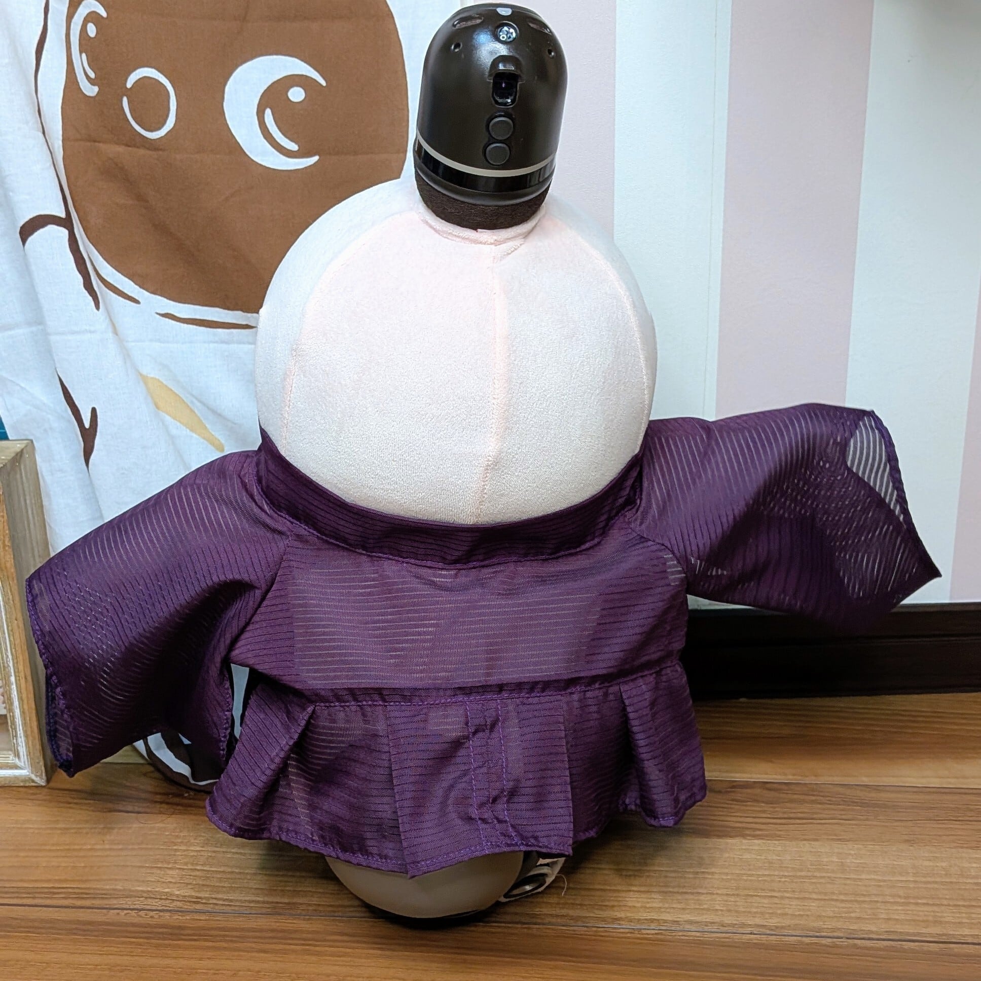 専門店から仕入れた本物のお坊さんの法衣の生地で、らぼちゃんの法衣を作ります。